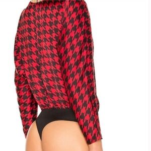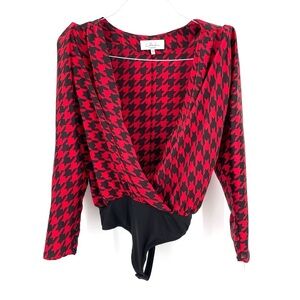 L'ACADEMIE The Victoire VNeck Long Sleeve in Red Houndstooth Bodysuit Blouse