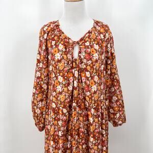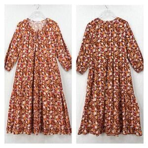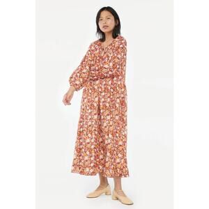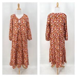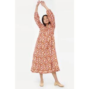 LACAUSA Berkeley Ruffle Midi Dress Womens XS Burnt Orange Floral Balloon Sleeves