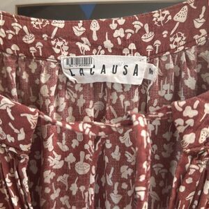 LACAUSA Dana Cotton Midi Dress Size Medium. Absolutely adorable. Reminds me of a Doen dress. Elastic at waist for perfect fit, including ties and elasticated sleeve ends. Please watch video sound on for description of flaws and see pictures :-) Enjoy!