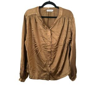 Brownish-green satin top. Full buttoned down. Belled sleeves. Loose, casual fit. Spun rayon, viscose blend. Great preloved condition! Size small