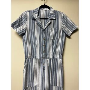 Easy dressing at it s finest. A summer twist on the trendy boilersuit in indigo striped cotton. Features short sleeves, button front, elastic waistband and a straight fitting leg.