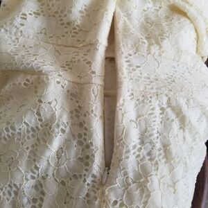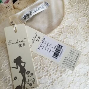 Scoop neckline, lace sleeves with tuile lining under flowing full skirt.