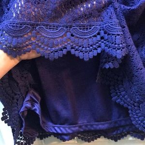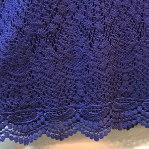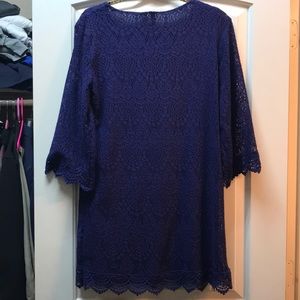 Pretty purple lace dress with lining. Three quarter, somewhat bell-sleeved. Scoop neck. Barely worn. Beautiful dress, just doesn’t fit me anymore!