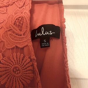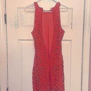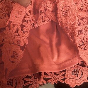 Only worn once to senior graduation. Absolutely stunning coral color . Sleeveless zips up in back .Halter style dress measurements are 35 inches long from halter part around neck to bottom of dress . Waist across measurements 14 inches and halter around neck 8 inches from side to side . Dress has a beautiful flowered lace over top of solid satiny dress .