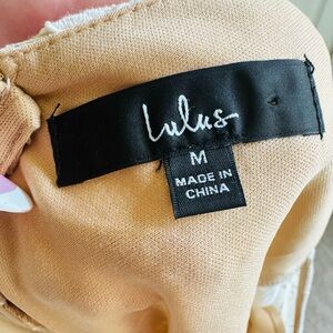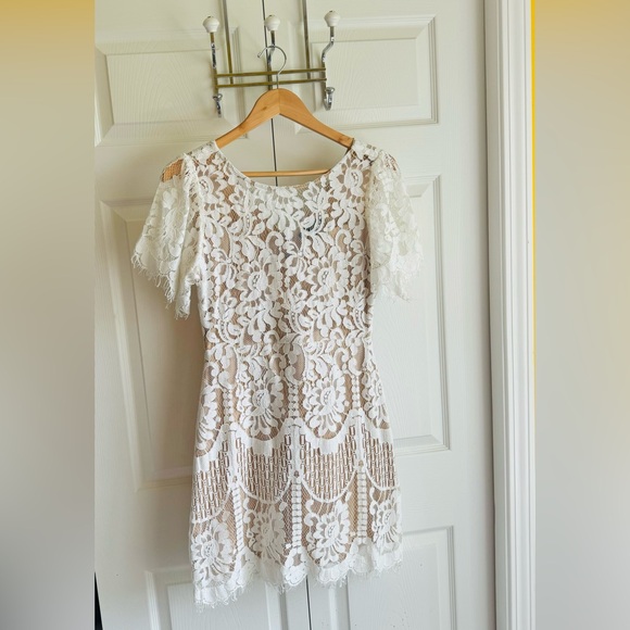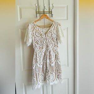 Women’s lace dress with tan/neautral underlay. Worn once for wedding shower. Beautiful and comfortable fit. 🤍