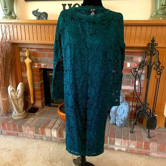 Green lace dress w/lining, midi length, rounded neck, no lining on upper neckline of dress (see picture). Has stretch. Worn once.