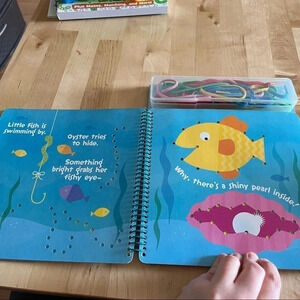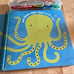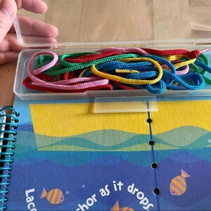 Amazing toy for fine motor skills, sewing is very important and this book makes it easy for kids to practice. Gently used condition from normal use. The container holding the strings doesn’t stay closed so I secure it with a rubber band when not in use.