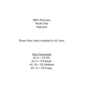 sgfashion Measurements for US Size XS / AU 6: Bust: 35: Hips: 38" Inseam: 3.5" Length: 34" Sleeve Length: 5" Waist (elastic, relaxed): 24"