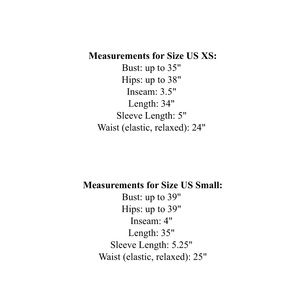 sgfashion Measurements for Size XS (garment flat): Length: 34" Leg Opening: 14" Sleeve Length: 5" Shoulder to Shoulder: 15" Underarm to Underarm: 17.5" Waist (elastic, relaxed): 12"