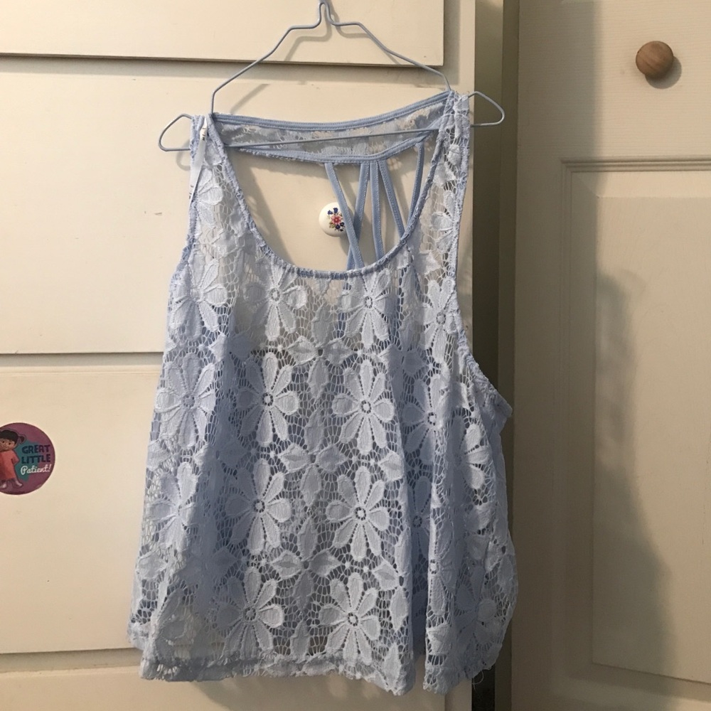 • Lacey blue top • floral detailing • crossed open back • fits more a M/L!•