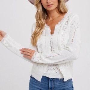 This elegant cami sweater is defined by its delicate lace straps + neckline that lend it a touch of romantic allure. Covered in a charming eyelet pattern, it effortlessly balances casual style with feminine sophistication. This piece is perfect for layering under your favorite cardigan or blazer, or it can be worn solo on warmer days, making it a versatile addition to any wardrobe. Pair it with our Lace Trimmed Knit Cardigan.