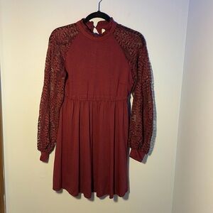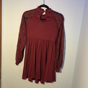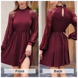 - features: lace puff sleeve, ruffled high neck, a line, keyhole, flowy swing