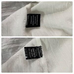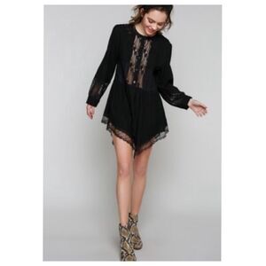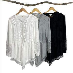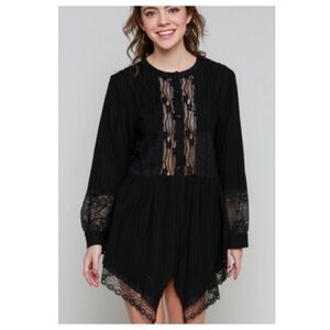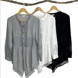 Dainty lace detailed "PREMIUM" fabrication woven top featuring lace contrast fabrication on center front and sleeve, buttondown closure with china collar and pleats on shoulder sides, and finished with shark bite bottom with lace trim sewn on hem. (Sleeve has a placket with button closure)