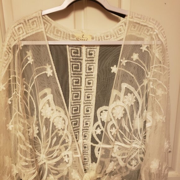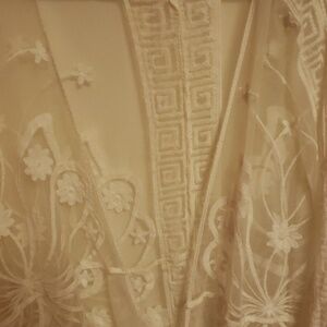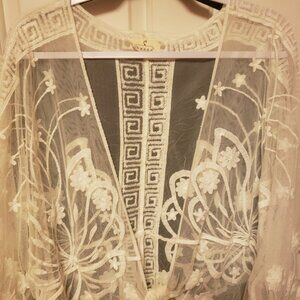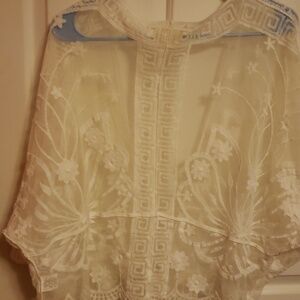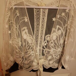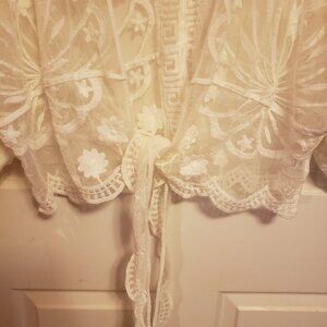 This is a pre-owned medium lace wrap. It has beautiful embroidery and scalloped edges. This has that bohemian look. Smoke Free Home