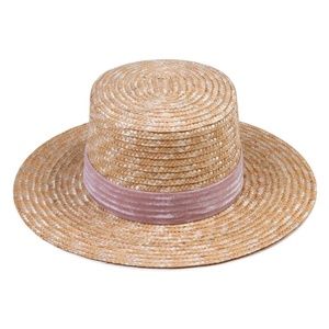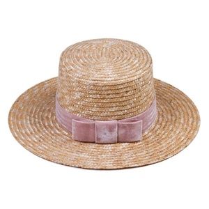 A tall crowned boater, featuring a natural straw weave with plush vintage Swiss velvet band and back center box bow detail. Bring some sunshine to your spring or anytime of year!