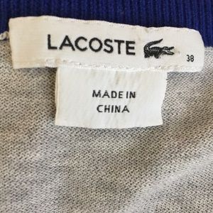 Absolutely stunning Colorblock Cardigan from Lacoste. Features a beautiful combination of blue, grey and black. Signature alligator logo on bottom corner of sweater. Warm, yet Lightweight- perfect for spring! Size 38 is the equivalent of a Medium, Size 6 according to sizing charts!
