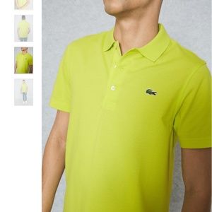 Soft and comfortable pure cotton fabric Collar neck and short sleeves Dual button front placket Embroidered Lacoste logo branding. Very pretty yellowy green color. Size 9 so size 4XL. Please see measurements (in pictures). Good condition except does have small hole (slightly larger than pin hole) on left shoulder. Please see pictures.