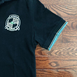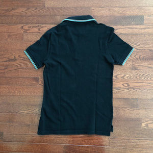 Black polo shirt. Gently worn a few times (USED). Size 3 (US = S). Green and white stripes on collar and sleeves. Measurements are according to Sizely.com (as attached): Neck to shoulder (#1) 9, Shoulder to shoulder (#3) 16 ¼ ,Chest (#4) 18, Hem (#6) 17 1/2, Front length (#7) 26.