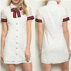 LACEY DRESS WITH BOW DETAIL AND STRIPED RIBBON TRIM ON SLEEVE ENDS