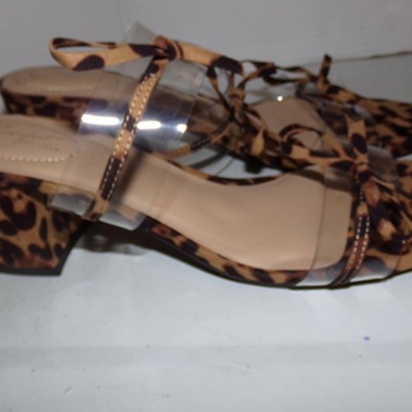 LADIES' COMFORT SANDALS LEOPARD DESIGN WITH TIES BLACK BROWN SIZE 10M. NWOT 3 INCHES TALL HEELS. NICE!