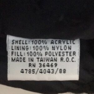 Made in Taiwan — Shell: 100% acrylic; Lining: 100% nylon; Fill: 100% polyester.