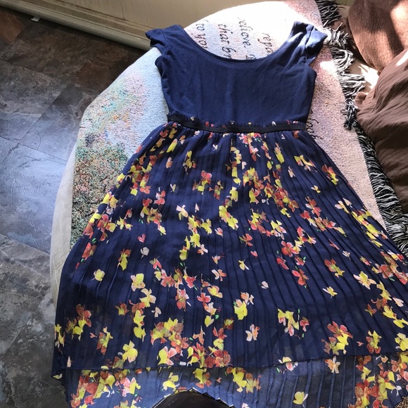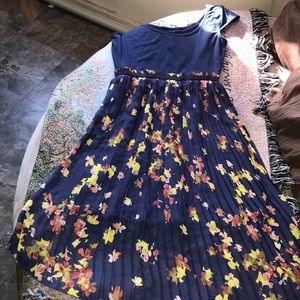 FLORAL ON THE BOTTOM AND BLUE STRETCH MATERIAL ON THE TOP.VERY COMFORTABLE DRESS FOR CHURCH OR JUST A PICNIC OUTSIDE