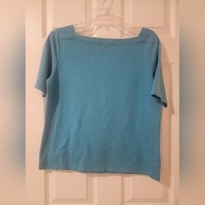 Ladies L.L.Bean teal short sleeve top (sz med - petite). Chest measurement across the front is 19-1/2". Measurement from shoulder to hemline is 22-1/2". The top is in great condition.