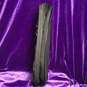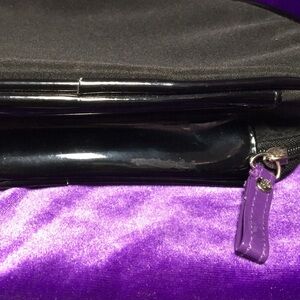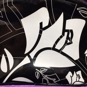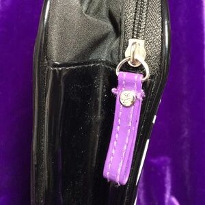 Here’s a Ladies’ Lancôme Black & White Zippered Makeup Pouch with a patent leather-look on the front. It measures approximately 9-3/8” x 6-5/16” x 2-1/2”.