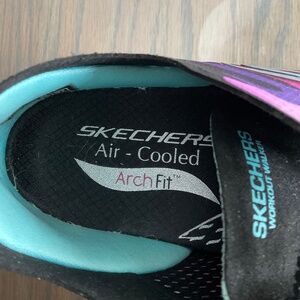 LADIES SKECHERS AIR-COOLED ARCH FIT, SIZE 8. HYPER BURST. GO WALKS. VERY GOOD CONDITION! NO ODORS OR STAINS. A LITTLE PEELING OF BLACK DESIGN (depicted in photo) THAT HAS NO EFFECT ON SHOE QUALITY OR PERFORMANCE. Mostly black with purple and turquoise accents. WELL CARED FOR. REPUTABLE SELLER FAST SHIPPER!