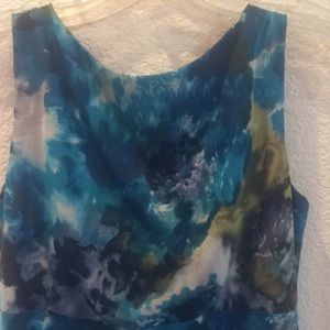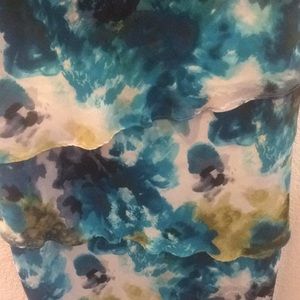 This is a ladies dress with a side zipper a draped neckline and multi tiers