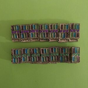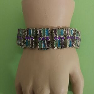 Purple, turquoise, teal stones surrounded by purple rhinestones.