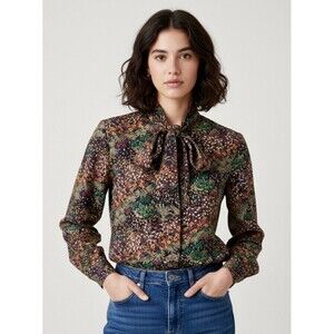 LADY ARROW Vintage 70s Polyester Floral Button Up Tie Bow Front Blouse Medium
