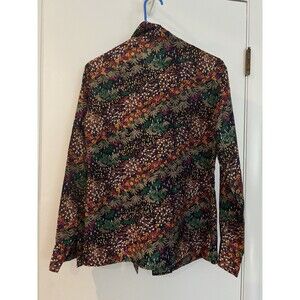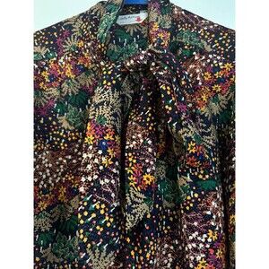 The LADY ARROW Vintage 70s Polyester Floral Button Up Tie Bow Front Blouse in size Medium is a stylish and retro addition to any woman's wardrobe. With a colorful floral pattern, long sleeves, and a tie closure, this blouse is perfect for casual occasions in the spring, summer, and fall. The polyester material is easy to care for with machine washable instructions, making it convenient for everyday wear. The vintage 70s theme and bow accents add a unique touch to this basic blouse from the Lady Arrow brand.