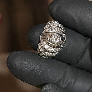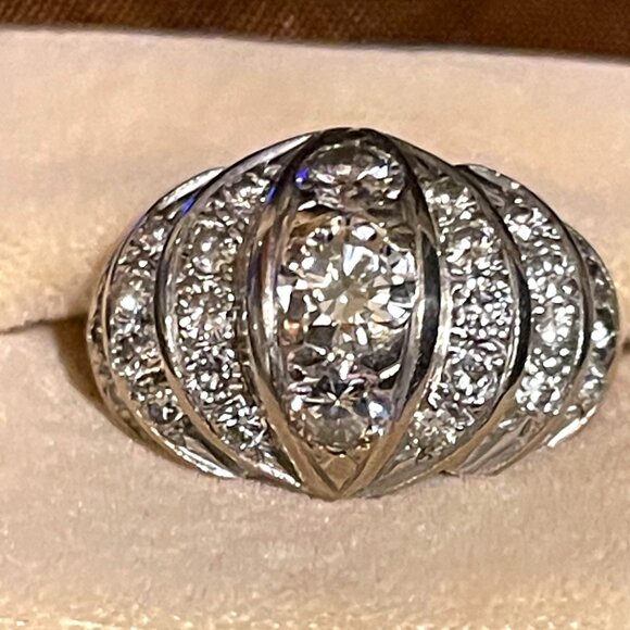 IS 14 KT WHITE GOLDTHE RING HAS 3 LARGE DIAMONDS AND 24 ACCENT DIAMONDS.THE CENTER DIAMONDS ARE BEAD SET IN CRESENT6 SHAPED THREE TIERED STEPS.THE RING IS 19 MM-3MM AND IT WEIGHS 4.5 DWTS.THE FINSH IS POLISHED AND IT HAS MILLGRAINED DETAILING.THE DIAMONDS ARE AS FALLOWS ALL DIAMONDS ARE OF INVESTEMENT QUALITY