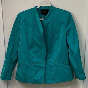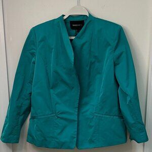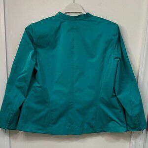 This lovely NEW jacket, size 14, is from Lafayette 148. The fabric is a lighter weight poly sateen in a rich aqua green the manufacturer calls “splash,” and the jacket is unlined and machine washable. It is styled with a slightly raised 1” collar, a pointed lapel, a crossover but unattached front, zipped pockets, zipper accents at the wrists, shaping seams in front and back, and modest shoulder pads. Measurements are: bust-44”(+), hip-49”(+), length-24”, sleeve length-23 1/2”. This pretty and versatile jacket is new and retails for $498; it will make a terrific addition to your spring wardrobe!