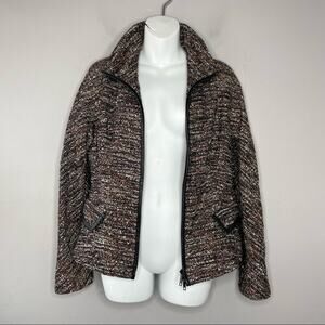 Black with neutral colors (almost metallic/rose gold/champagne/chocolate) in a tweed pattern zip up long sleeve blazer jacket with black faux leather trim. Two flap front pockets that are still sewn shut. Collar can fold down or stand up to keep your neck warm.
