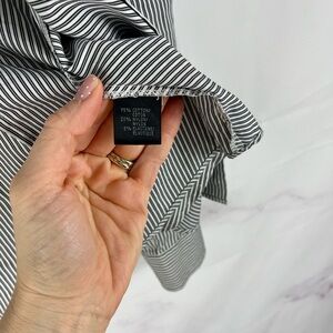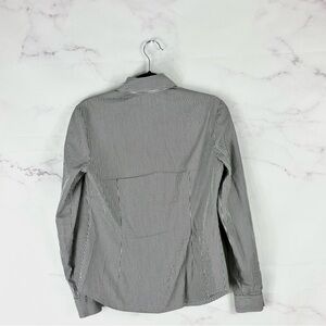 Lafayette 148 New York striped button-front blouse in classic black and white, designed in a luxe stretch cotton blend that holds its shape beautifully. Features a sharp pointed collar, refined vertical stripe pattern, and flattering tailored silhouette. Effortlessly elevates office looks, pairs chicly with denim, and layers seamlessly under blazers or knitwear for year-round styling. A polished essential for work, travel, or minimalist capsule wardrobes.