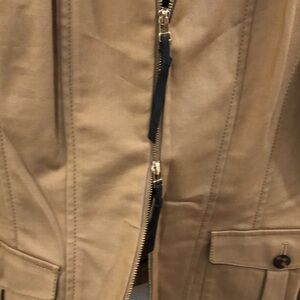 Khaki tan fitted utility jacket by Lafayette 148 New York. Full zip front opening with 2 zippers. Two front patch pockets with button flap closure. Ornamental tortoise shell buttons at cuffs. EUC. Size 8