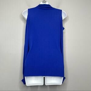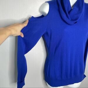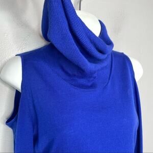Royal blue long sleeved sweater with cowl neckline and cold shoulder cut out design with cuffed hems at wrists. So soft.
