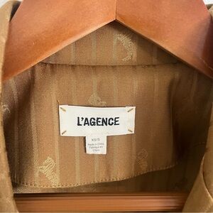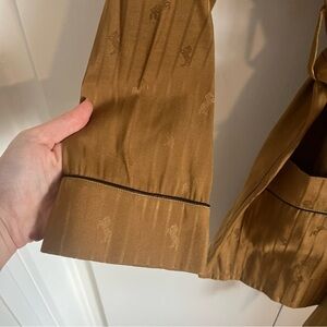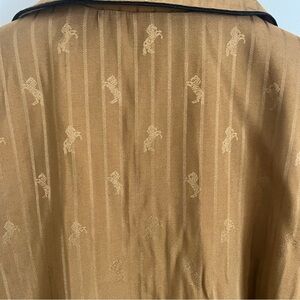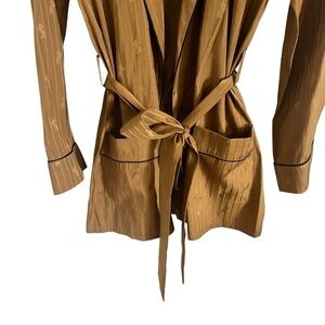 L'AGANCE Equestrian Flair Skyler Belted Satin Jacquard Jacket. Dark khaki golden mustard color. Black trim piping. Subtle monochromatic stripes and horse print throughout. Wrap style with removable belt sash (included). Large front pockets. Size XS/S.
