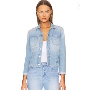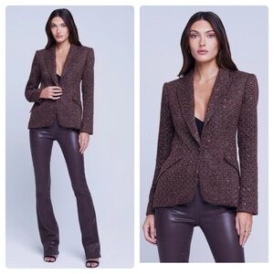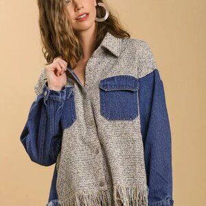 Brand new, NWT, L’AGENCE tweed white and denim jacket. Crewneck style open-front jacket in a tweed trimmed with denim and patch pockets.