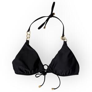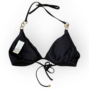A classic triangle bikini top, in classic black. In a secure four-way stretch nylon, this halter style ties at the neck and back for a fully customizable fit and includes hidden underwire for flattering definition and lustrous gold tie-tabs for an elevated touch.