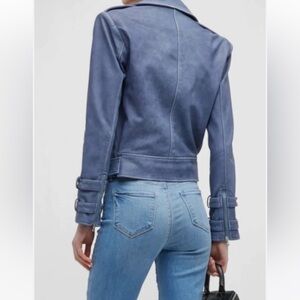 L’Agence Stylish billie blue leather motorcycle jacket with double-breasted design. Features a belted waist and zippered pockets. Very soft leather. High quality. Original price $$1,595. Bought last year. New with tags. Size small. Pit to pit 18 inches. No flaws