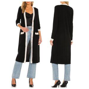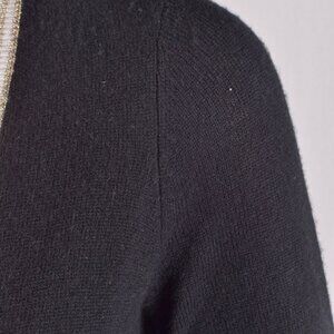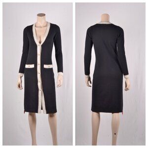 Elegant black cardigan with cream trim. Features button closure and front pockets. Perfect for layering.
