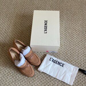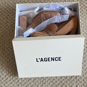 New with tags on, never worn L'AGENCE beautiful sand (tan) suede high heeled loafer. Includes box and shoe bag. Made of 100% Suede.