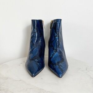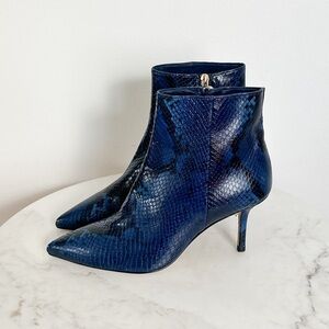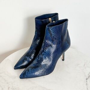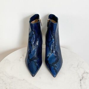 Elegant blue ankle boots with a sleek design. Features a pointed toe and stiletto heel. Perfect for a stylish look.