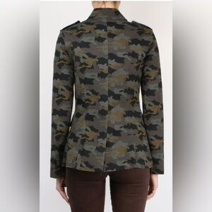 Military jacket in a camo print. Four flap pockets border the hidden-button placket, fold over collar. Very good pre-owned condition. Top black flaps over each shoulder, snap on buttons, slight discoloring on seams of flaps, not noticeable while wearing, see pics