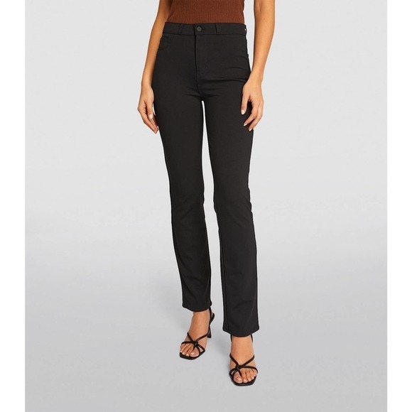 A high-rise, straight-leg pant in true-black premium stretch denim. Design gently hugs though waist, hip and thigh before extending straight to hem, slimming and streamlining the silhouette. Finished with five-pocket construction, zip fly closure and tonal button.
