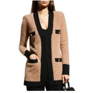 The Elin Four Pocket Camel Cardigan is full of warmth and polish. This woolly cardi is knit in a longline fit with contrasting trim and a quartet of pockets. Shoulders are padded for extra height and structure. Crafted of a textured merino wool blend. This four-pocket style features goldtone dome buttons and a contrasting trim. Originally $550!