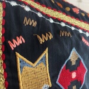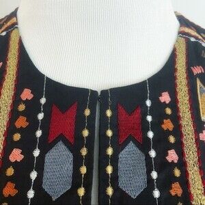 Embroidered design on bib and sleeves in shades of red, gold, bronze, and blue on black background